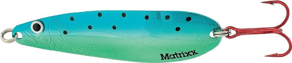027752055454The Matrixx Spoon was designed for salmon and trout trolling applications specifically influenced by experienced great lakes and pacific northwest anglers. It features accentuated dot patterns and accented pearlescent tape. Flaw-free silver plating, and hand painted details along with engraved life-like fish patterns. Super-sharp black-nickel VMC hooks are long-standing features of this erratic fluttering action trolling spoon. UV Enhanced finishes makes the Matrixx more visible in low light at deeper depths. A must for any serious salmon or trout troller!