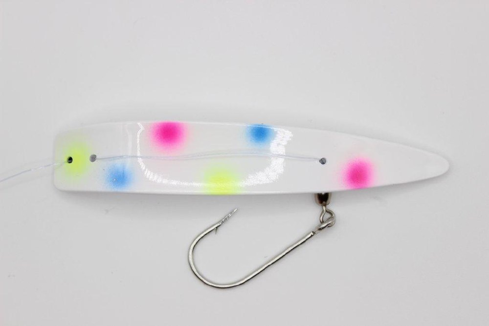 056652051570The 4.5 Apex is a banana shaped trolling lure designed for saltwater Salmon or larger Trout trolling applications. The 4.5 Apex (named for it's 4.5" size), from Hot Spot Lures, is one of the most popular Salmon/Trout trolling lures on the market today due to the vibrating and spinning action at any applicable trolling speed. The Apex is a very easy lure to use - it can be trolled alone or with a flasher and still achieves the desired action and ultimately the desired results. The 4.5 Apex comes stock rigged up with 72" of a 25lb monofilament leader line, 4 bead chain swivel and a 4/0 siwash hook. This 4.5" Apex model is a great choice when trolling for chinook and coho alike rigged by itself or behind a flasher - the suggested trolling speed for the 4.5 model is 2.8 to 4.0mph.