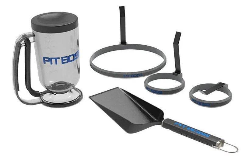 Includes: pancake dispenser, two 4" egg molds, one 8.25" omelet mold, and grub shovel with bottle opener